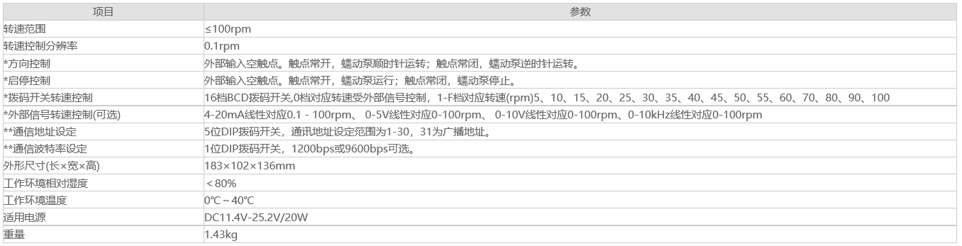 T100系列ODM蠕動(dòng)泵驅(qū)動(dòng)器由57步進(jìn)電機(jī)選配多種控制方式形成的體積小、結(jié)構(gòu)簡(jiǎn)單、控制簡(jiǎn)便的蠕動(dòng)泵驅(qū)動(dòng)器產(chǎn)品系列。主要在設(shè)備、儀器中配套使用,實(shí)現(xiàn)430mL/min以下的流體傳輸。采用撥碼開(kāi)關(guān)結(jié)合外部信號(hào)的控制方式,外部信號(hào)可選4-20mA、0-5V、0-10V、0-10kHz,并可提供采用RS485通訊控制方式的產(chǎn)品。采用底板、面板兼容的安裝方式。