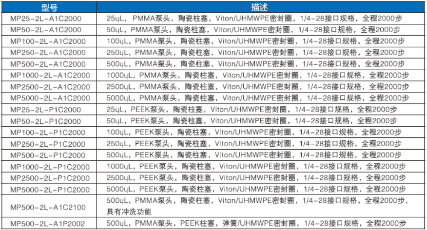 提供多種泵頭材質(zhì)(PMMA/PEEK/PEI及其它)、多種柱塞材質(zhì)(陶瓷/PEEK及其它),多種密封圈材質(zhì)(UHMWPE/Viton/FFKM/302ss及其它)。針對不同屬性的溶液選擇適合的材質(zhì),可延長泵的使用壽命,降低設(shè)備維護成本。