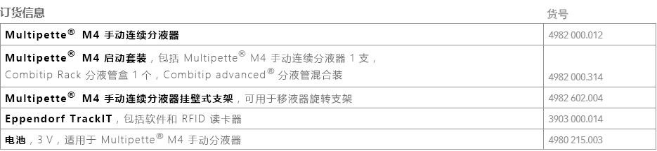 訂貨號:4982000314 Multipette? M4 手動連續(xù)分液器結合9種不同規(guī)格 Combitips advanced? 分液管,提供從 1 μL——10 mL 的分液范圍,一次吸液可完成最高 100 次分液。特別適合于高粘度、易起泡、易揮發(fā)、危險性等問題液體的移取及分裝。