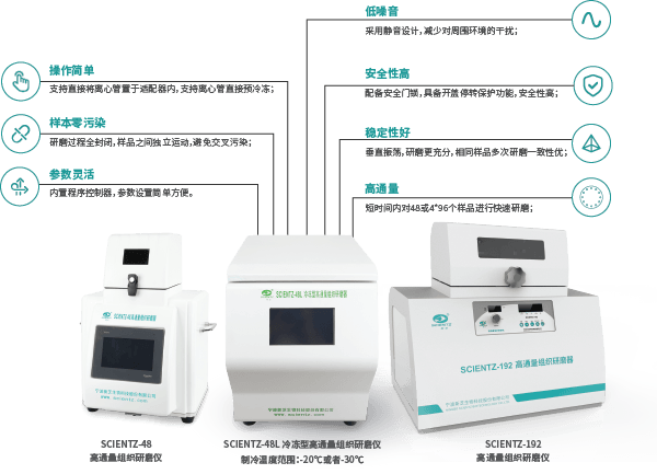 SCIENTZ-192高通量組織研磨器也同樣采用高頻垂直振蕩的方式,用戶可以選擇不同的研磨珠對(duì)不同性狀的樣品在離心管內(nèi)直接對(duì)樣品進(jìn)行研磨,研磨管內(nèi)樣品與研磨球相互碰撞,其產(chǎn)生的研磨剪切力和撞擊力使組織完全破碎,從而有效分離提取原始DNA、RNA。