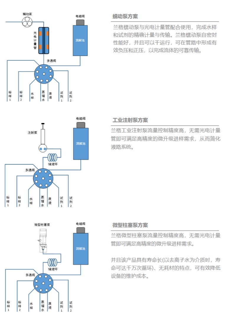 在在線水質(zhì)檢測(cè)系統(tǒng)中,蘭格產(chǎn)品主要用于傳輸待檢測(cè)水樣,以及各種檢測(cè)試劑。蘭格可提供不同種類的精密泵解決方案:蠕動(dòng)泵、工業(yè)注射泵和微型柱塞泵,以滿足不同檢測(cè)系統(tǒng)的需求。