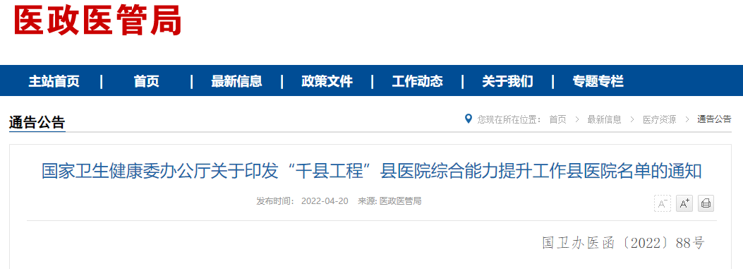 其旨在提高縣醫(yī)院綜合能力,滿足縣域居民基本醫(yī)療服務(wù)需求。未來根據(jù)各縣醫(yī)院醫(yī)療服務(wù)能力評(píng)估和工作推進(jìn)進(jìn)展,《名單》進(jìn)一步篩選和擴(kuò)充。(點(diǎn)擊文章左下角“閱讀原文”,查看完整《“千縣工程”醫(yī)院名單》。)